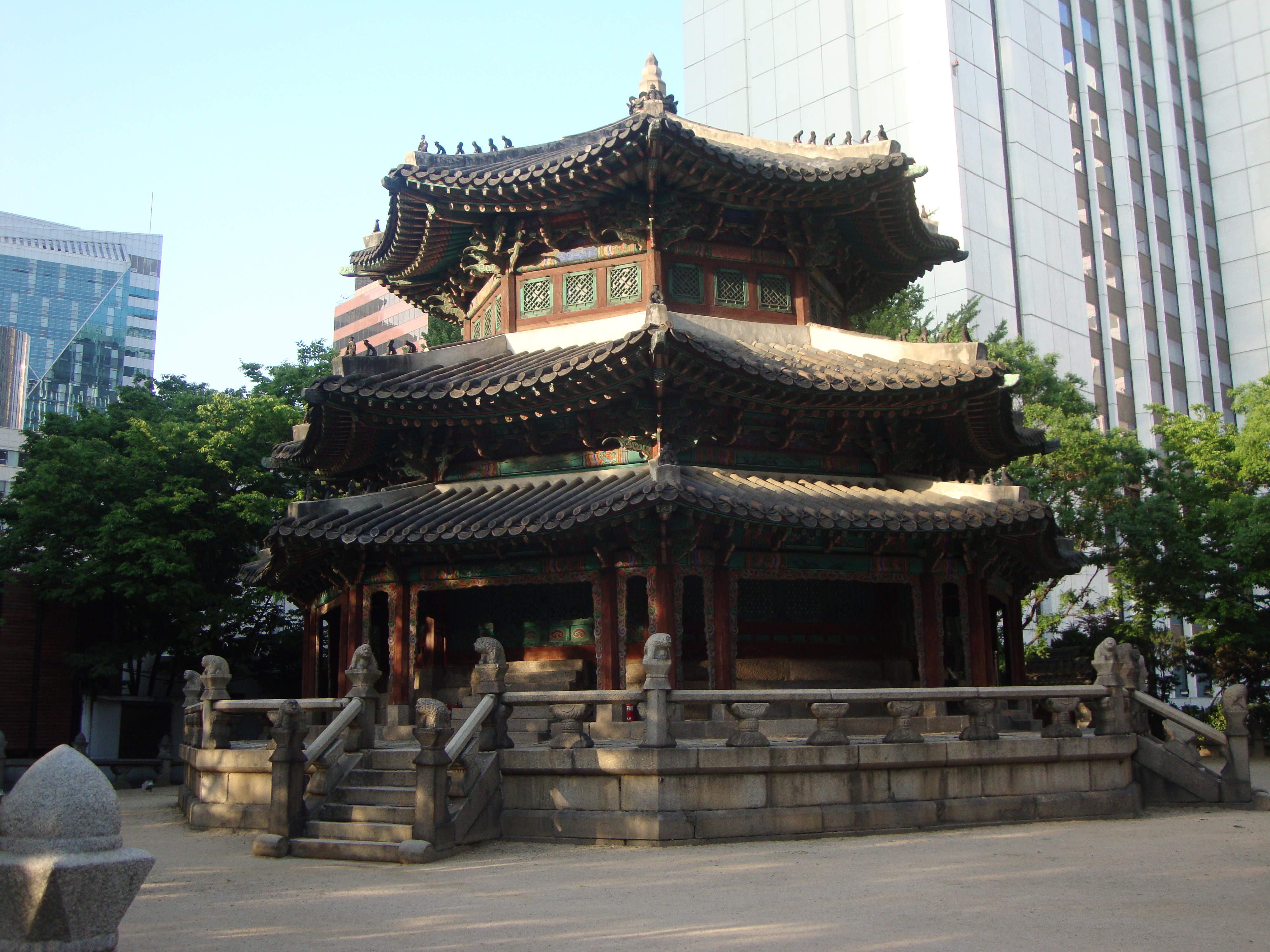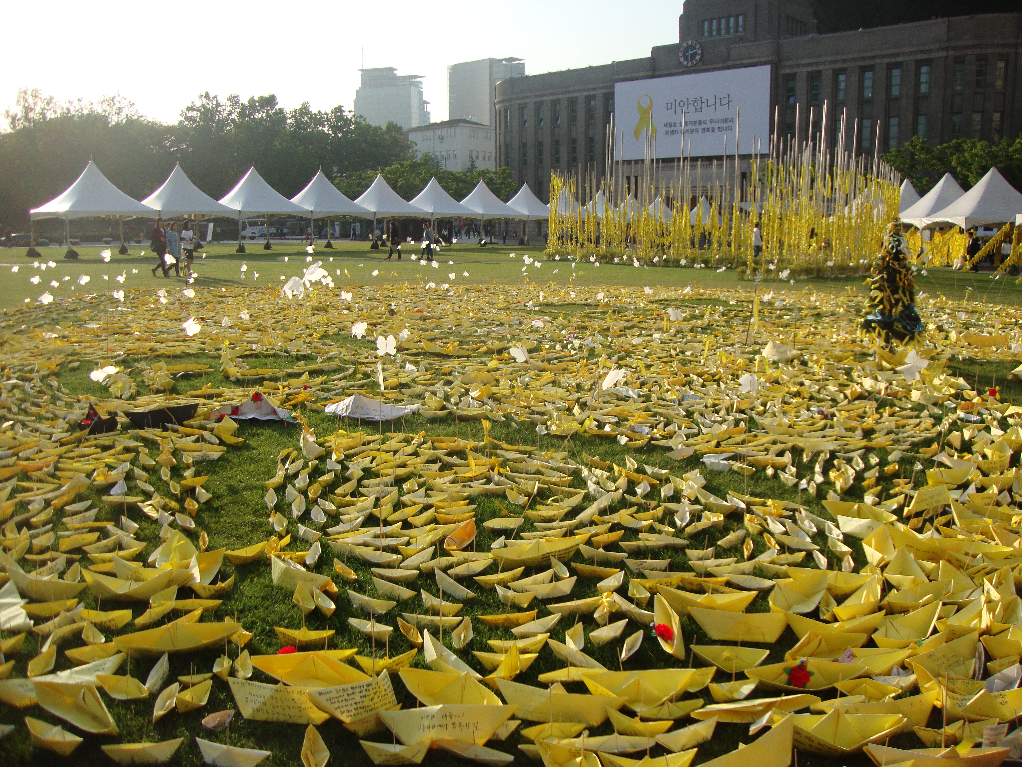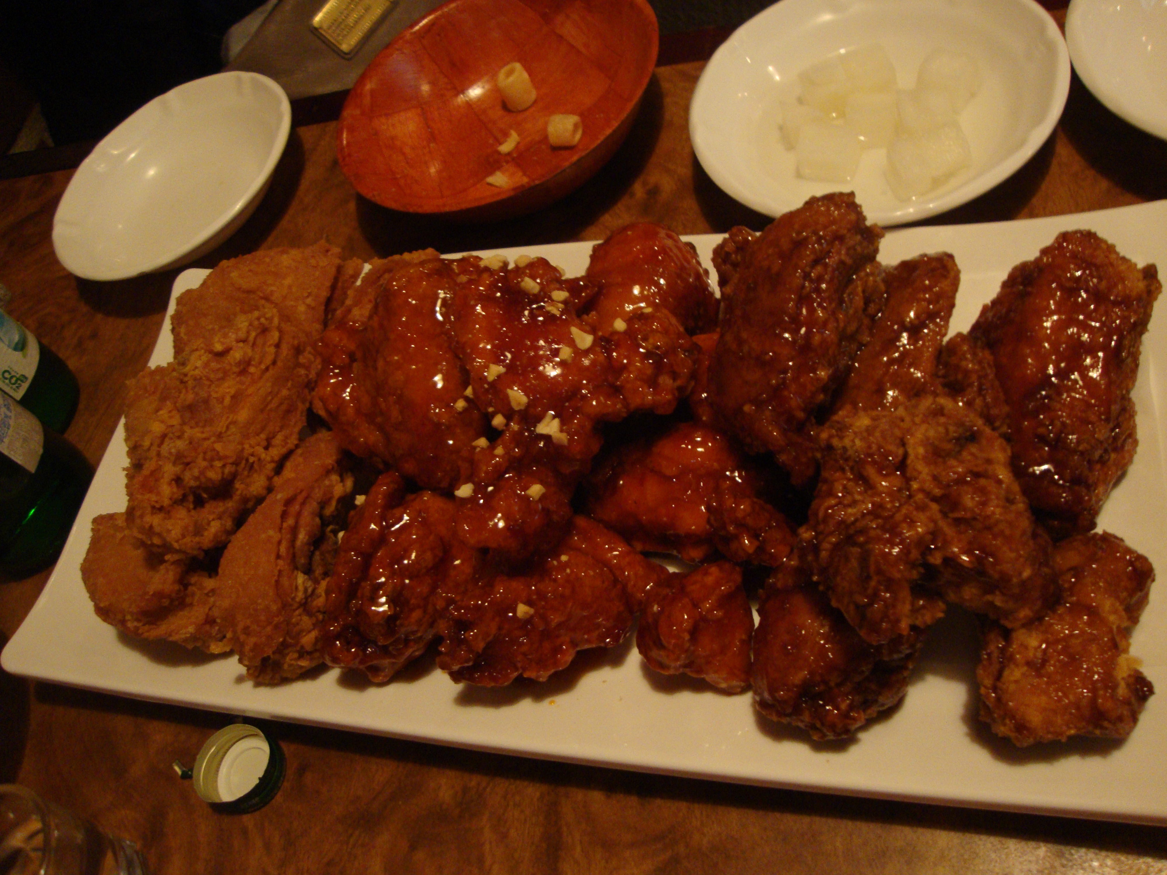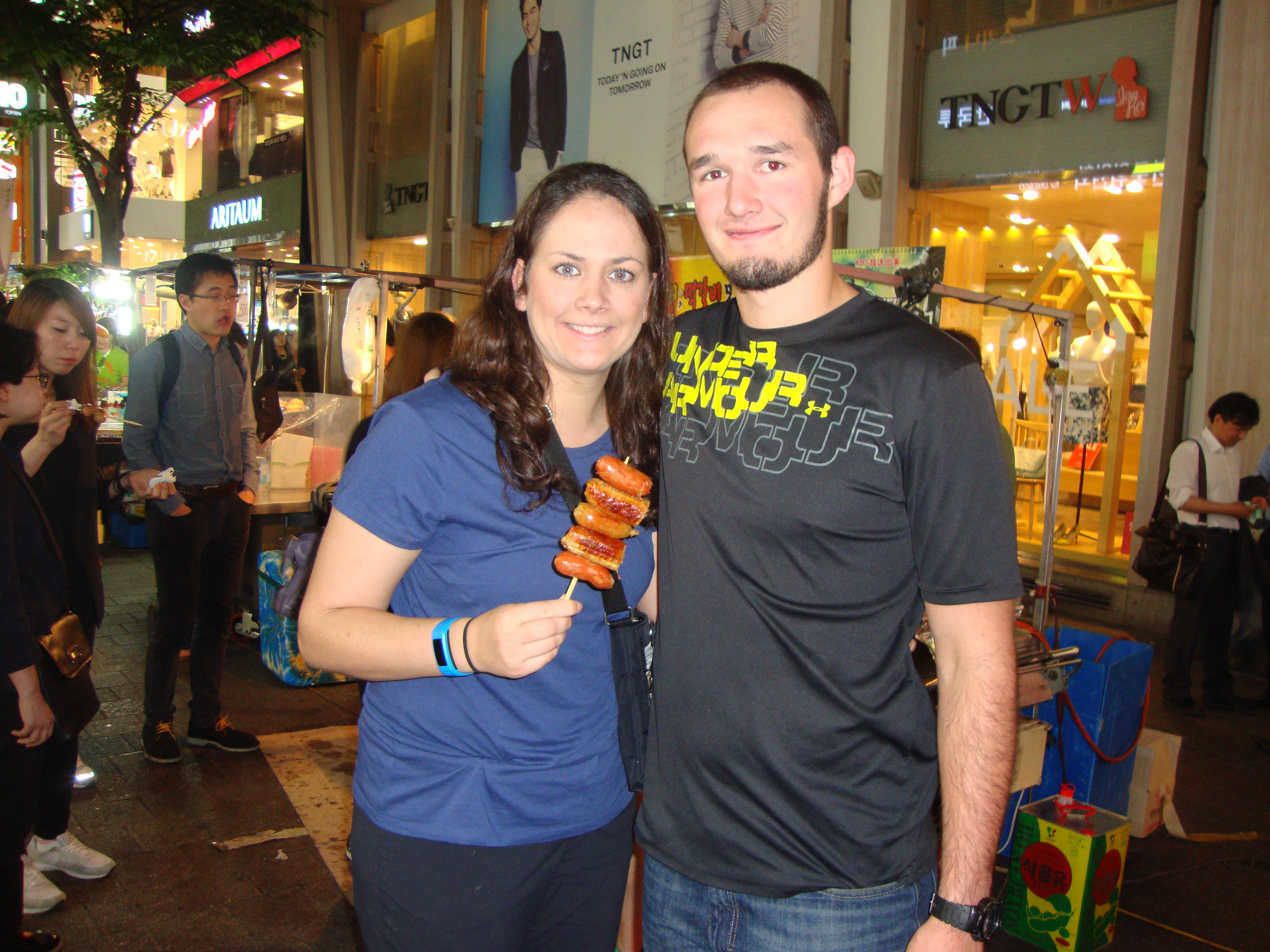 After a quick rush finalizing packing and attempting to fit my next several months into one small backpack, my husband drove me, my mom, and my cousin to the airport. We had to leave our house at 4:15 AM to fly out of MCI. After two way too short layovers (Denver and San Francisco), we arrived at ICN (very nice airport!) at 1:30 AM the next day (3 PM local time), which calculates out to be 14 hours ahead of home. At the airport we met up with my brother and his girlfriend Jenna. Together we took the train into Seoul and got to see some countryside along the way. After a train transfer, we walked 0.2 miles to our hotel at The Westin. Along the way there was a giant memorial to victims of the ferry that sank off South Korea’s western coast April 16, leaving more than 300 dead or missing. We got settled in by 7:00 PM that night, so we thought we’d walk around outside to see what how the area looked. We found that there were a lot of people out for late on a Thursday night. Stores were open and there were numerous street vendors selling food and other items. We tried these sausage dumplings on a stick and watched a local make these string honey pecan desserts (yum!). After walking for awhile, we went to a local joint where we had Korean fried chicken made with three different flavors. I only slept 45 minutes the night prior, so I was nodding off quite a bit. I was back to the hotel by midnight.