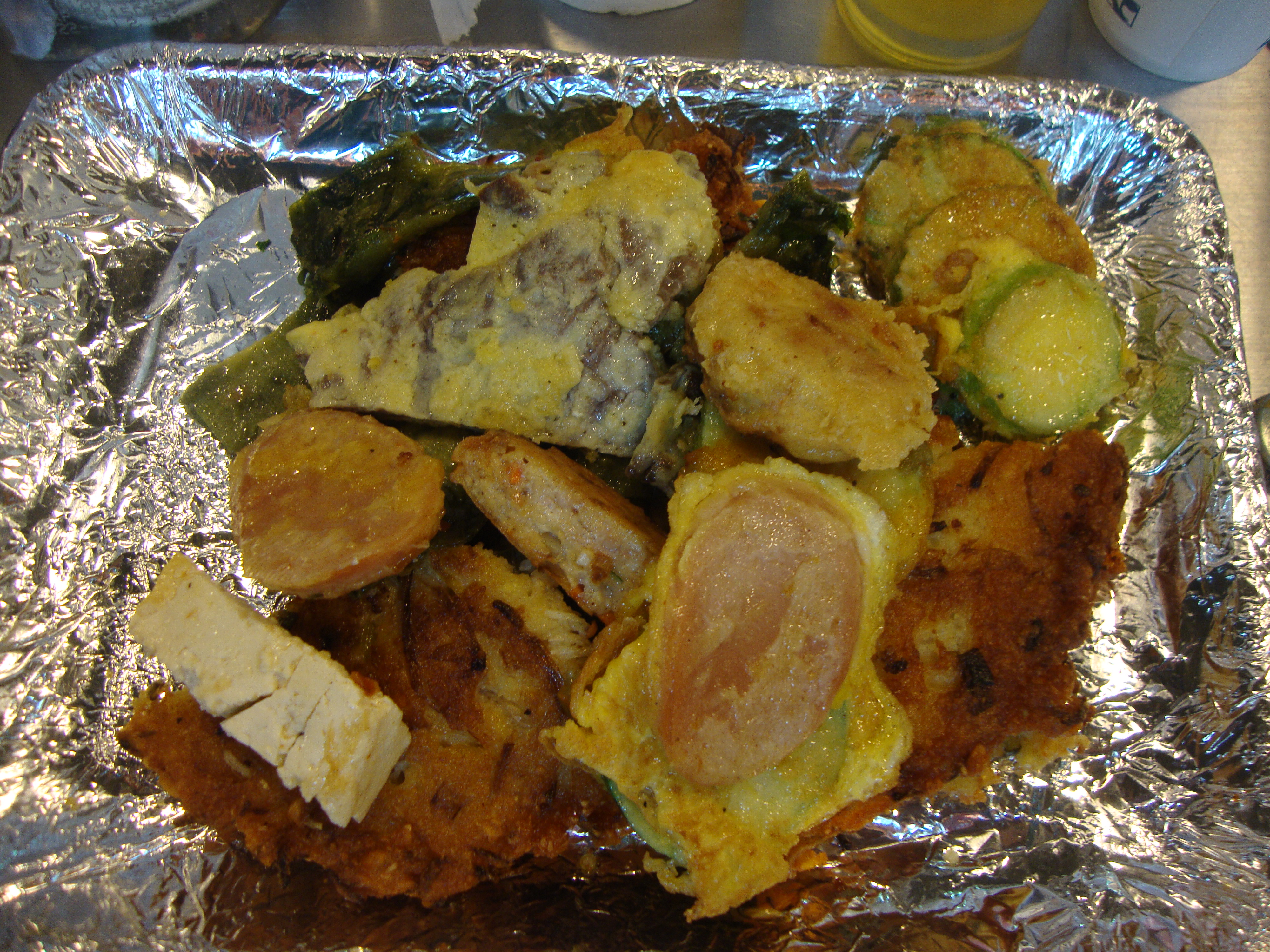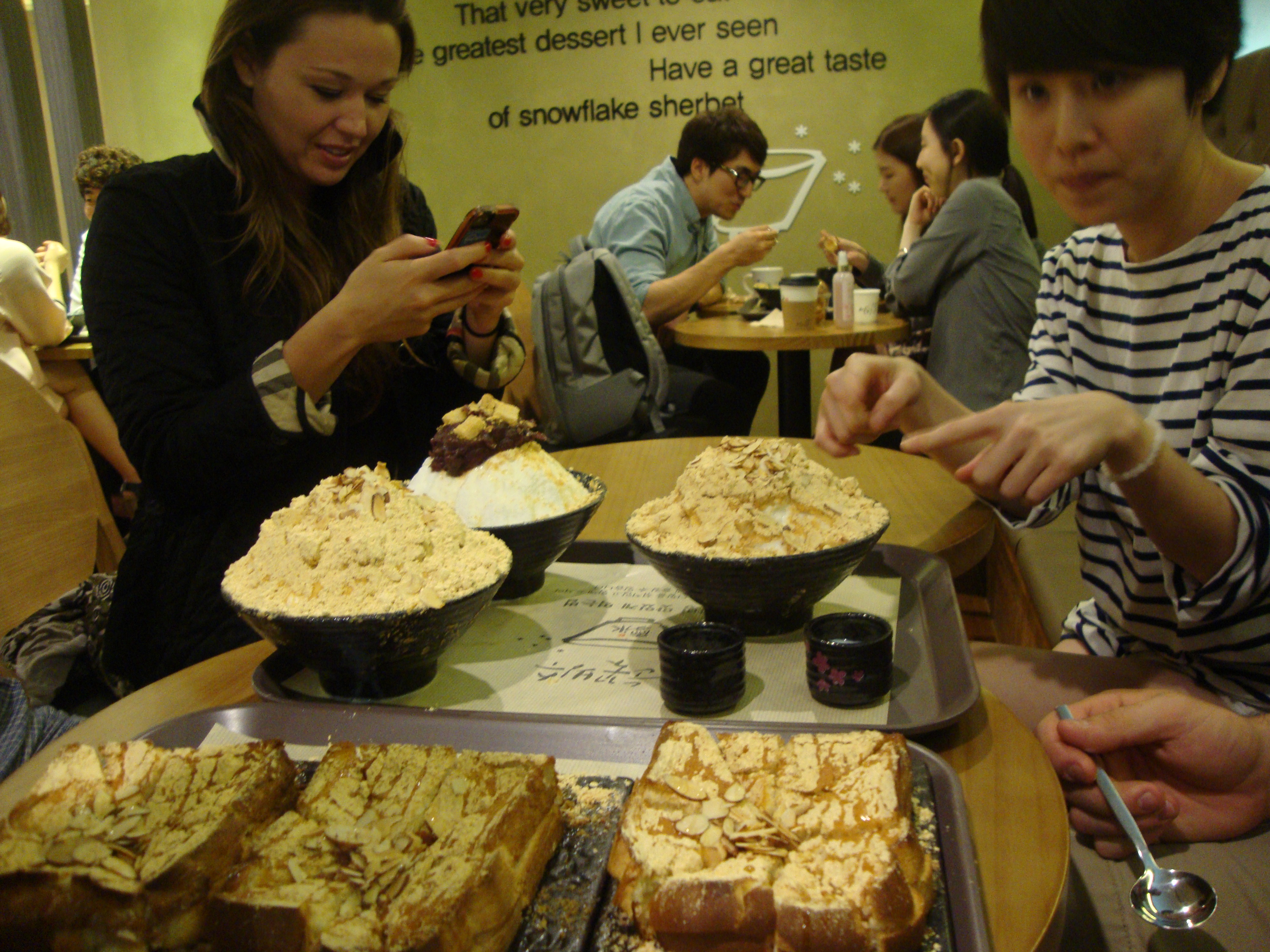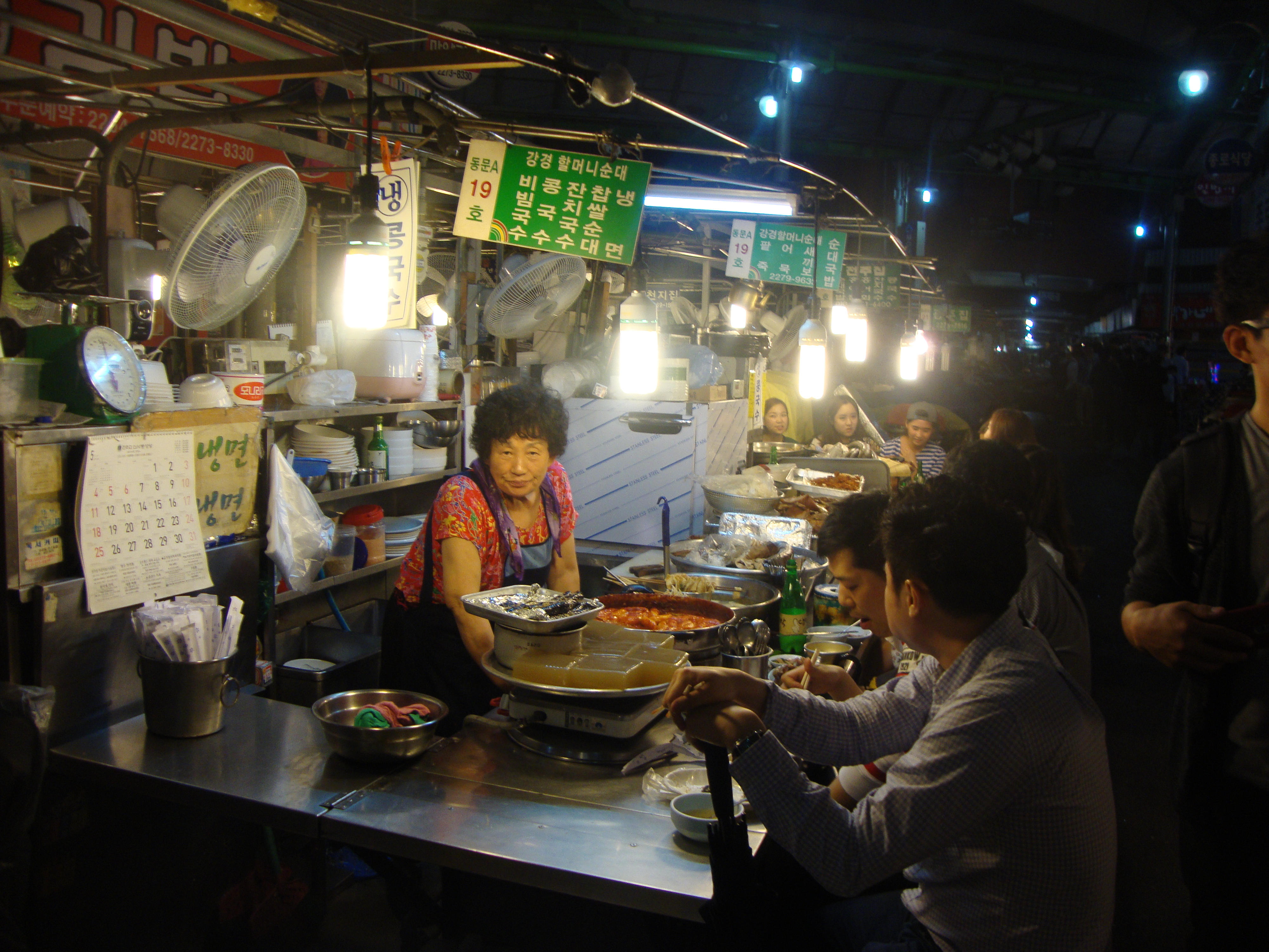 We crossed the Han River (divides Seoul) to visit the Gangnam area (Gangnam Style: http://youtu.be/CH1XGdu-hzQ) which is a posh neighborhood full of upscale shopping. We went into the Galleria and the Hyundai Department Store and enjoyed just observing. We had some more ice flakes at a dessert place that Damin often visited, (well worth the stop!), and then we walked along the Cheong-gye-cheon, a large garden creek through the city. It was raining, but it allowed us to walk alone making it a very peaceful place. We then hurried through the rain to Gwangjang Market where we sat down for street food with a local vendor.