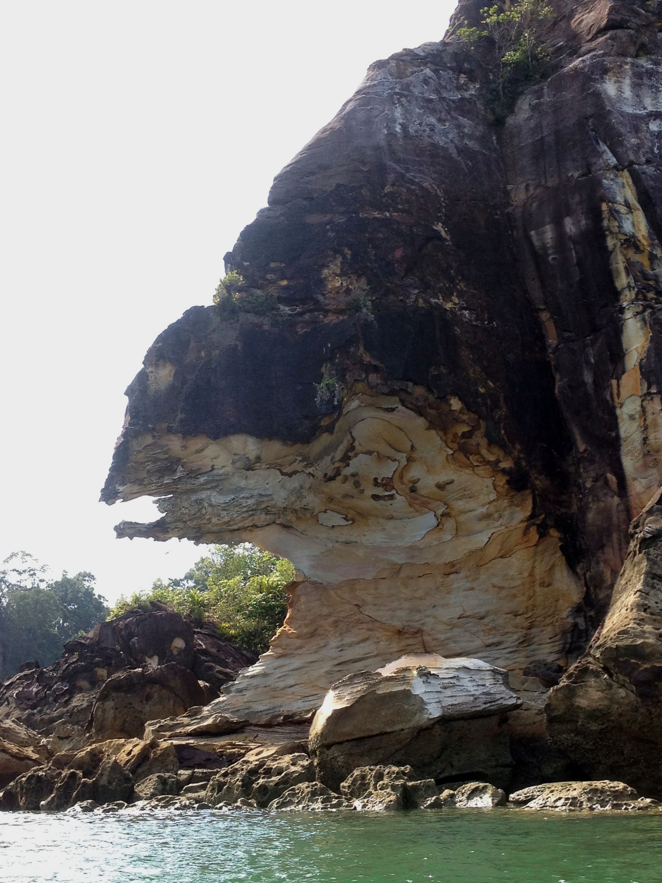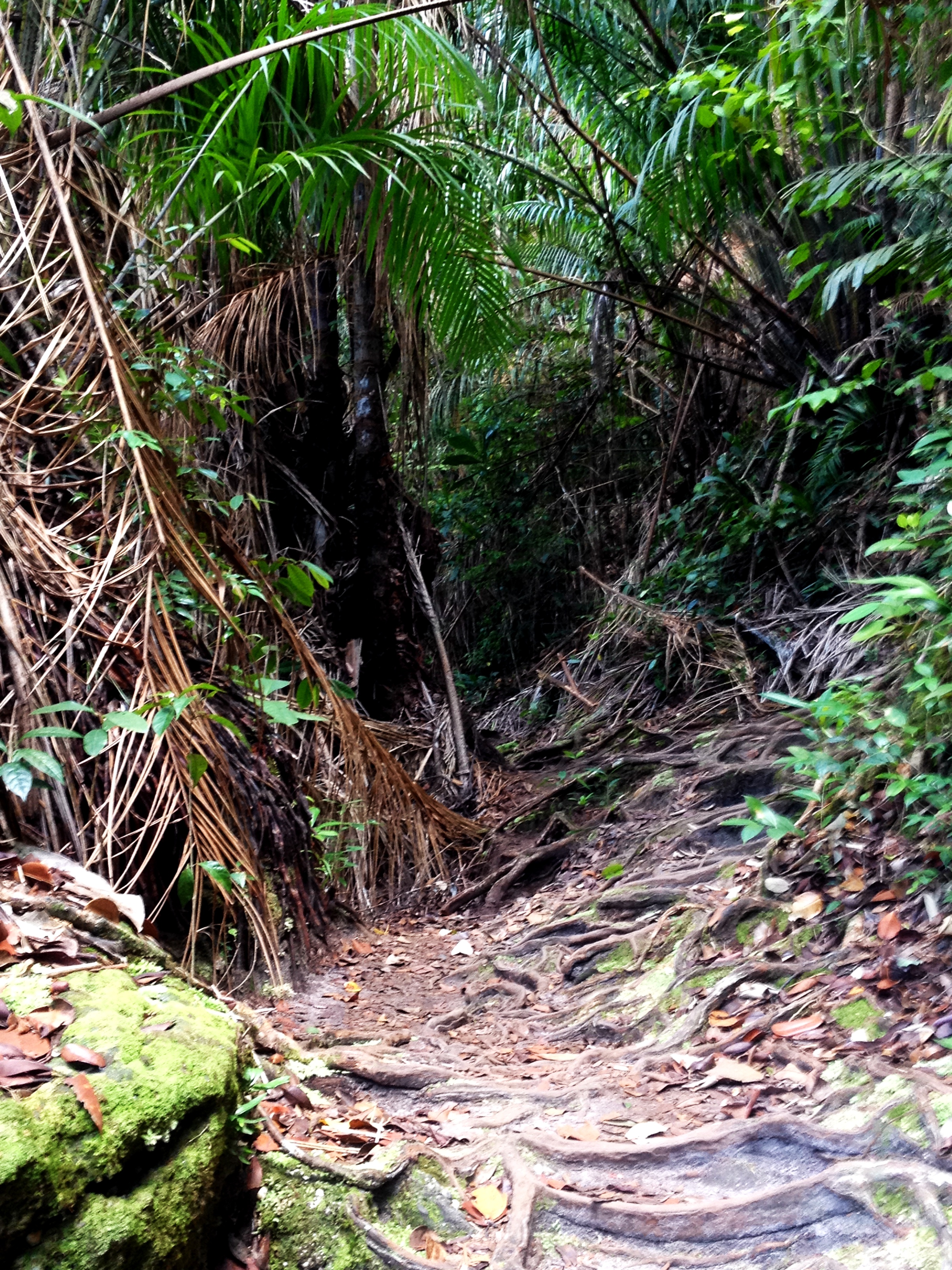 The next morning I took the bus to Bako National Park. The park has 17 trekking trails, all clearly marked and color coded, making it quite easy for me as a solo traveler. About half of the back trails were closed. I was only there for a day, so I had plenty to do. Once I arrived, I took a small boat to the park’s entrance. Bako is full of hills, cliffs, carnivorous plants, and home to around 150 endangered proboscis monkeys (ones with the long nose). At the park entrance, there was a large hairy pig (later I found out was called a bearded boar) walking around and some very small (not proboscis) monkeys. I did two of the treks in hopes to see some wildlife. The hikes were a bit more strenuous than I expected, but I was able to cut two hours off of the expected time on the map, allowing me to do them both. The paths were covered in tree roots. The roots helped assist during the climbing section, and they made the pathways look pretty cool. On Paku Trail, I was supposed to see the proboscis monkeys, but I did see any. The path ended at the ocean with a beach cove. On the way back, I saw a fist-sized spider in the middle of a large and beautiful web. The next trail, Lintang Trail, was a six kilometer circular loop with some nice views and vegetation. It had some interesting changes in terrain, but I still didn’t see wildlife other than birds and bugs. I had given up the hopes of seeing the long-nosed monkeys because I had started my descent back to the park’s headquarters. However on my last half kilometer in the middle of the forested area, I found myself all alone in the middle of a troop full of proboscis monkeys. I could hear the branches crashing, and I could see blurred streaks of motion. Through the next half kilometer, I counted around 25 large monkeys. It was fun experience walking through their world, their natural habit, as they jumped around me.