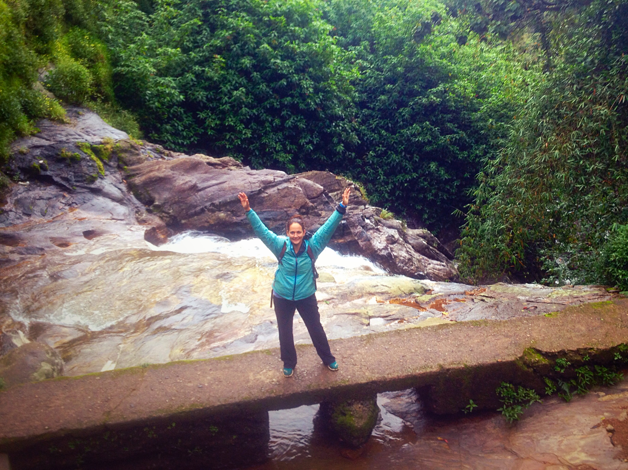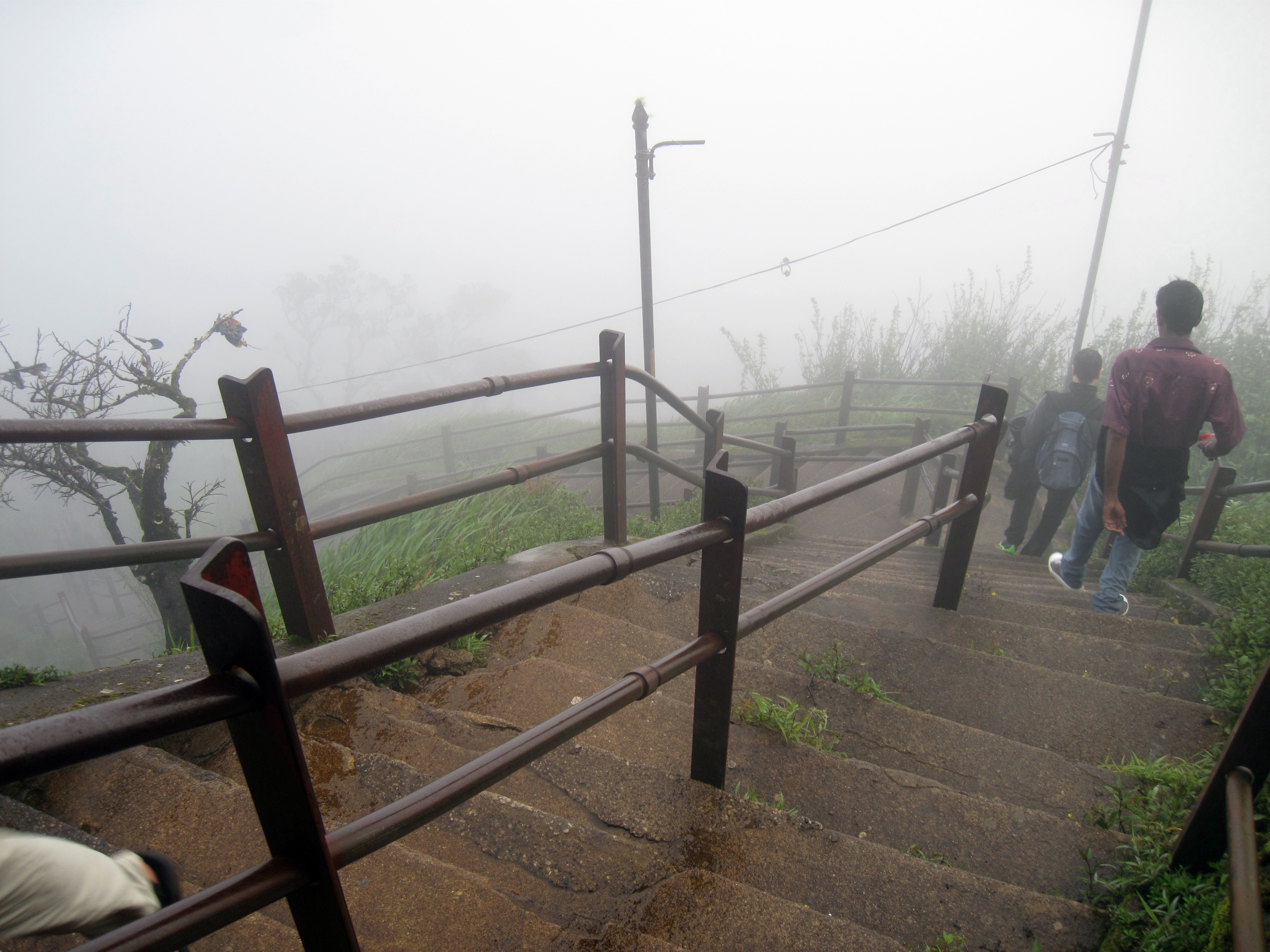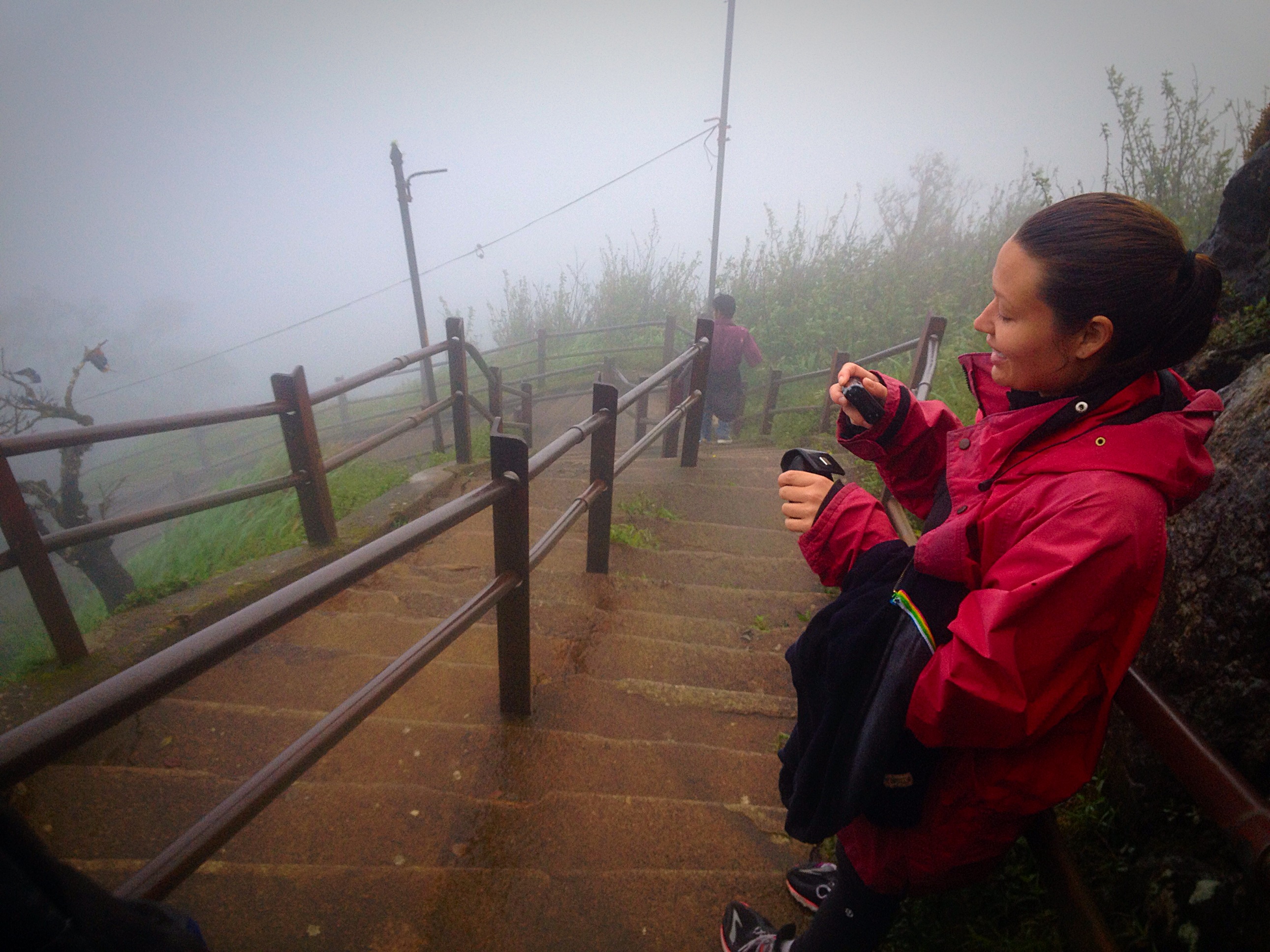 The next morning, the three of us (Jenna, Peter, and I) took the famous train through Sri Lanka’s hill country to Hatton to transfer to complete the world-known pilgrimage of Adam’s Peak. The train had the old time romantic feel, and it chugged through some jaw-dropping scenery full of tea plantations. We arrived in Hatton and transferred by minibus through more unbelievable roads to Dalhousie, the starting off point for Adam’s Peak. We found a place to place our bags and rest before starting our 2:00 AM journey up the mountain to see the sunrise. We heard the top of the mountain gets extremely cold, so we packed warm gear, rain gear, and flashlights and headed out to the darkness and rain. Call us crazy, but everything I read said it was totally worth it. Some Christians and Muslims believe that Adam’s Peak is said to be the place where Adam first stepped foot when he was thrown out of the Garden of Eden (many connecting the idea that Sri Lanka was the original Eden, which I could definitely believe after my visit (source: Wikipedia)). The sunrise was supposed to happen at 6:00 AM, so we had four hours to get there. I was expecting a slow and pleasant climb to the top with some flat spots. I was wrong. It was straight up, all stairs. They were well built and safe, but they were straight up…the whole way. Alongside me I had Jenna, a girl that runs everyday (even on our trip), and Peter, a marathon runner. Next to them, my body decided to reject me and non-existent knee pain decided to remind me that it was still a part of my all too close past. About an hour and a half into the stairs, I had them go on without me because I could tell they were still full of energy, and I wanted to slow my pace. After much insisting on my part, they finally skipped ahead. I slowed my pace, and I felt much better. I knew I still had time to get to the top, but I had no idea how far away I was because it was still dark and extremely cloudy. I could probably only see about ten feet in front of me. I met people along the way, some struggling like me, and some full of life like Jenna and Peter. Hikers that were better prepared would tell me how far I had left, although after the trek I don’t think I believed them. I made it to the top by 5:30 AM with plenty of time to see the sunrise. I found out later that it was 5,200 steps to the top and double that to go back down. The distance isn’t far (14 kilometers round trip from Dalhousie), but oh the steps… As told, the top was freezing. I hadn’t noticed it was cold until I stopped moving, and it was extremely wet on top of the mountain because we were literally in a cloud. Aladdin sure made clouds look more enjoyable. So we waited for the famous sunrise and triangle shadow that appears (our reward), and we waited, and waited…6:00 AM, 6:30 AM, 6:40 AM. Nothing. For about ten seconds, we saw one hole of sky, and the entire group squealed thinking we would see the sun…but nothing. I heard a guide next to us saying he’d done the trek 38 times and only not seen the sunrise for three of the times. That made me feel loads better. The journey down was a completely different type of pain. It was now the wobbly legs and knee pain, but it was so much easier on the heart rate. However, it was still 5,200 steps down. Jenna and Peter ran ahead and got us breakfast ordered at the hotel. I wobbled in after them thinking to myself that I better have lost a few pounds after that workout. It’s the sense of accomplishment that makes it all worth it, and I guess we’re officially pilgrims now. It ended up being a seven hour journey round trip (for me), including quite awhile waiting at the top. We showered and rested for about an hour before taking the minibus back to the train station. It was another wonderful train ride to Ella through tea plantations, smiling people, lakes, and waterfalls.