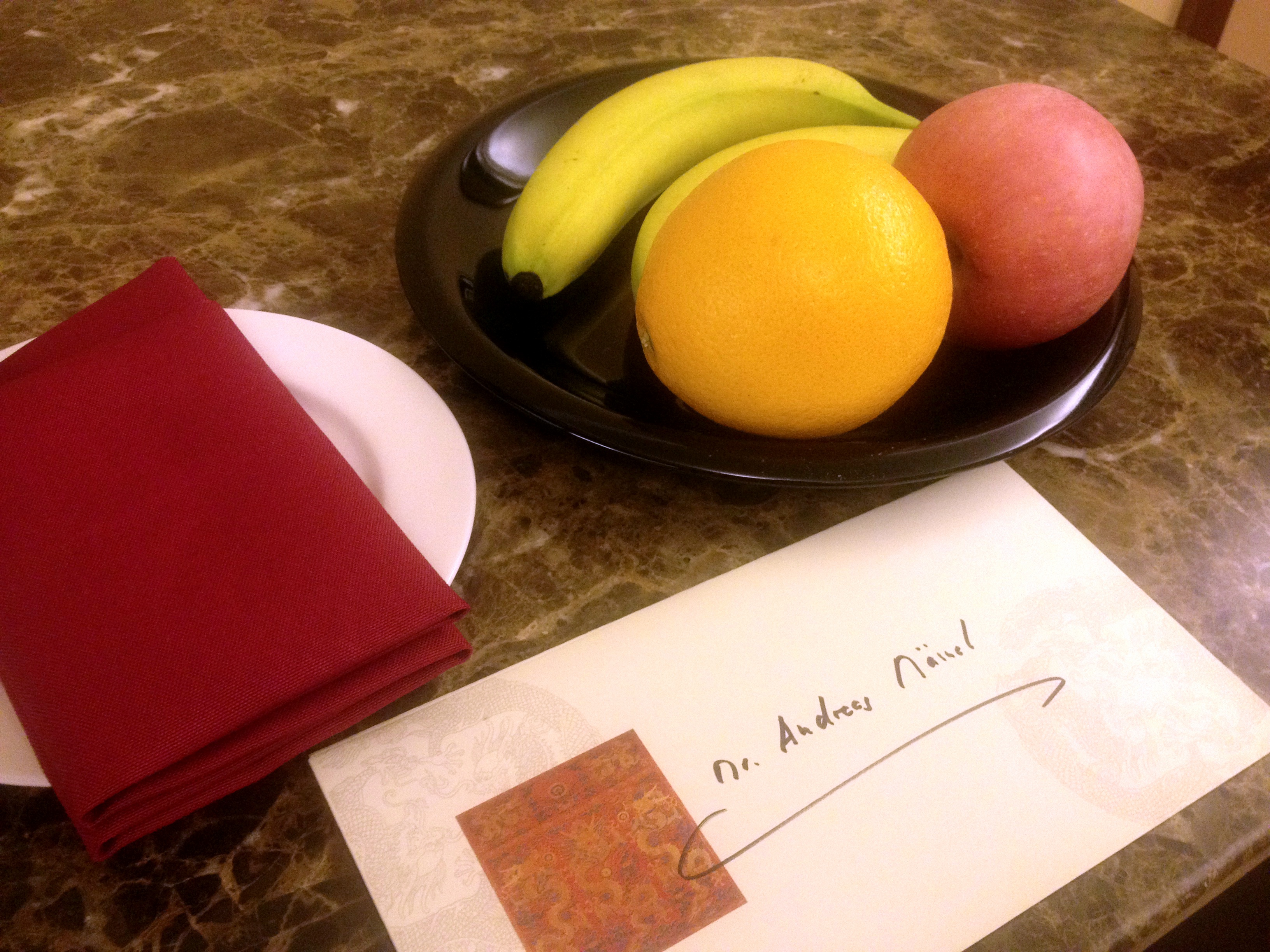 I had remaining Starwood points and was running low on my cash, so I decided my time in China would be spent in Starwood hotels, moving from place to place trying to get the next level of status. The first stop was on the northeast side of the city closer to the airport: The Great Wall Sheraton. The hotel staff spoke little English. They tried to put me in a room with two queen beds, which I didn’t believe I’d booked (looking back I actually had…oops). Since they didn’t have any others available with only a king bed, they upgraded me to a suite. It was so late, I think they decided to give me somebody else’s suite. I had fruit and a personalized card made out to Dr. Andrees Naisel. The rooms were outdated, but they appeared to be quite grand back in the day.