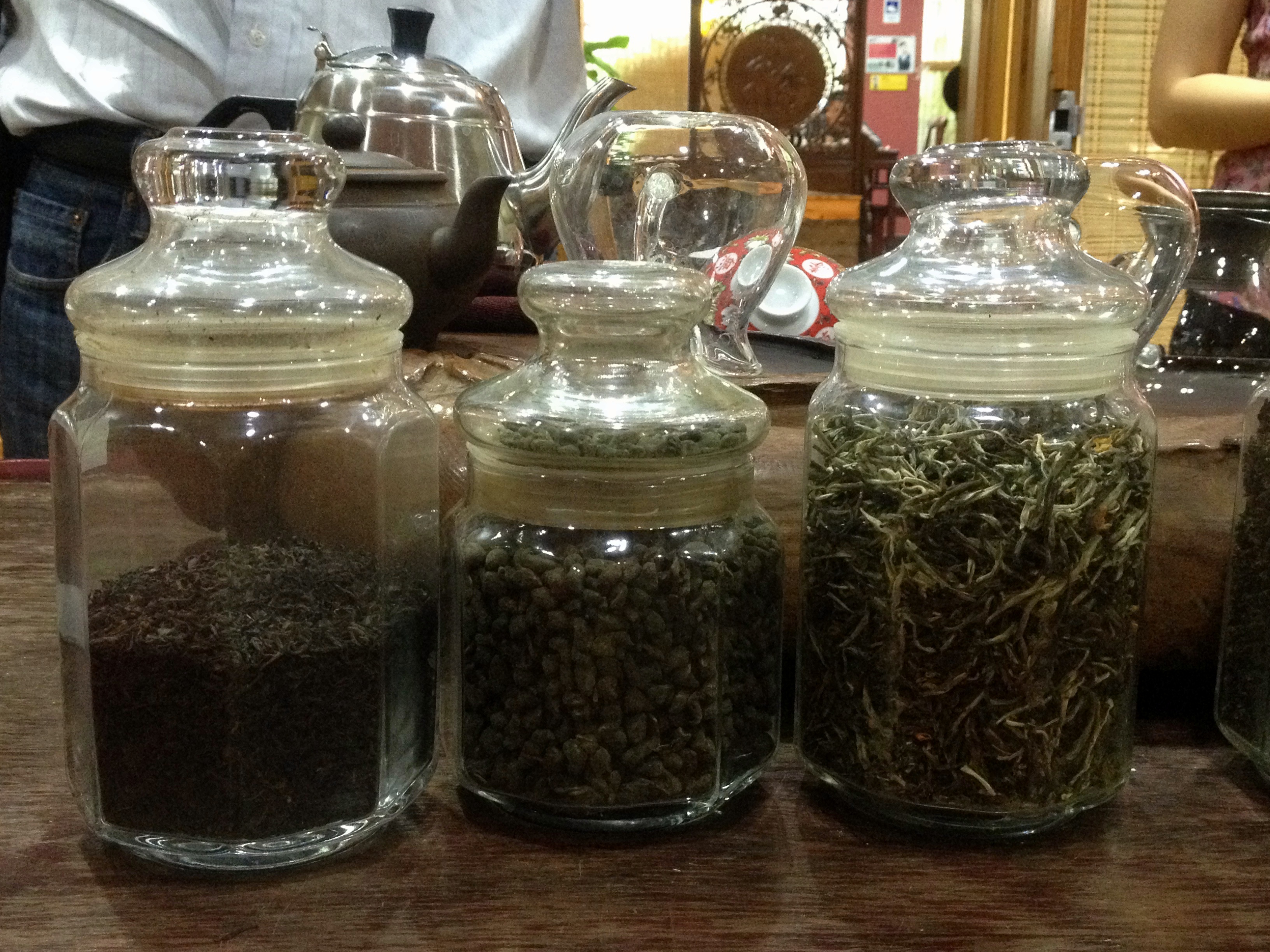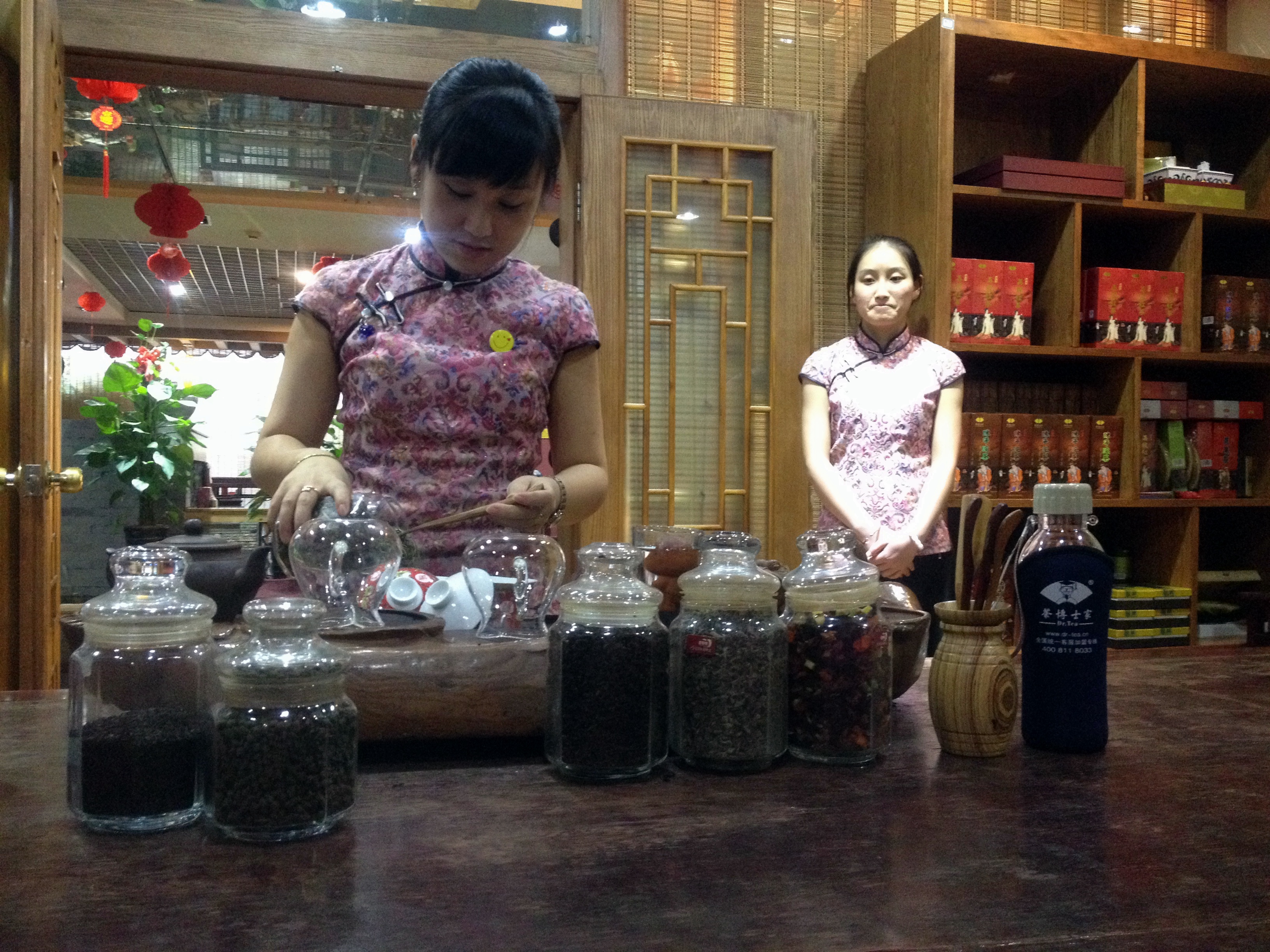 The next morning I did the Great Wall tour. I’d heard about the Mutianyu section. It is known for distinctive and unique charm. We circled through the city to get the other tourists from their hotels. Once the bus was full, our first stop was the site of the 2008 Beijing Olympics. We saw the Water Cube (where Michael Phelps got eight medals) and the Bird’s Nest Stadium. Then we headed to the Great Wall. It was farther away than I originally expected. The tour guide talked the whole bus ride and several of his stories were quite annoying. As we pulled up to the wall, I was impressed (even from a far distance). I’d always heard about it’s greatness in size, but it truly is incredible to see it in person. Per a survey on wikipedia, the wall stretches 13,171 miles (21,196 km). It is on top of the mountain peaks, and I can’t imagine the number of people that died building it. Although I met some friends on the bus, I enjoyed the solo journey walking on the wall. After the heavy smog in the city, the air in the mountains seemed refreshing. The sky was blue, and the guide said it was very unusual (even out there it is normally smoggy). On the way home, we stopped by a tea shop.