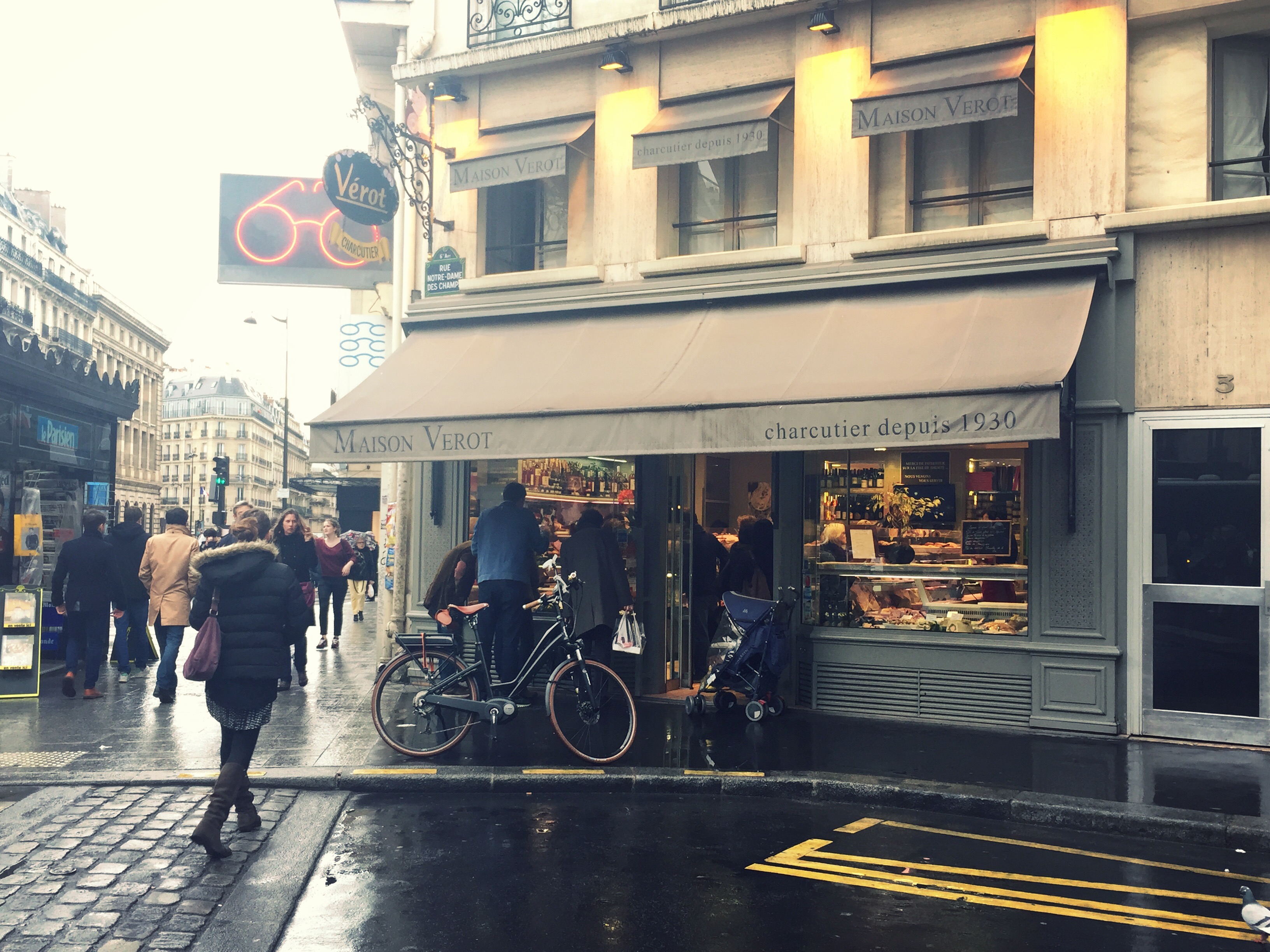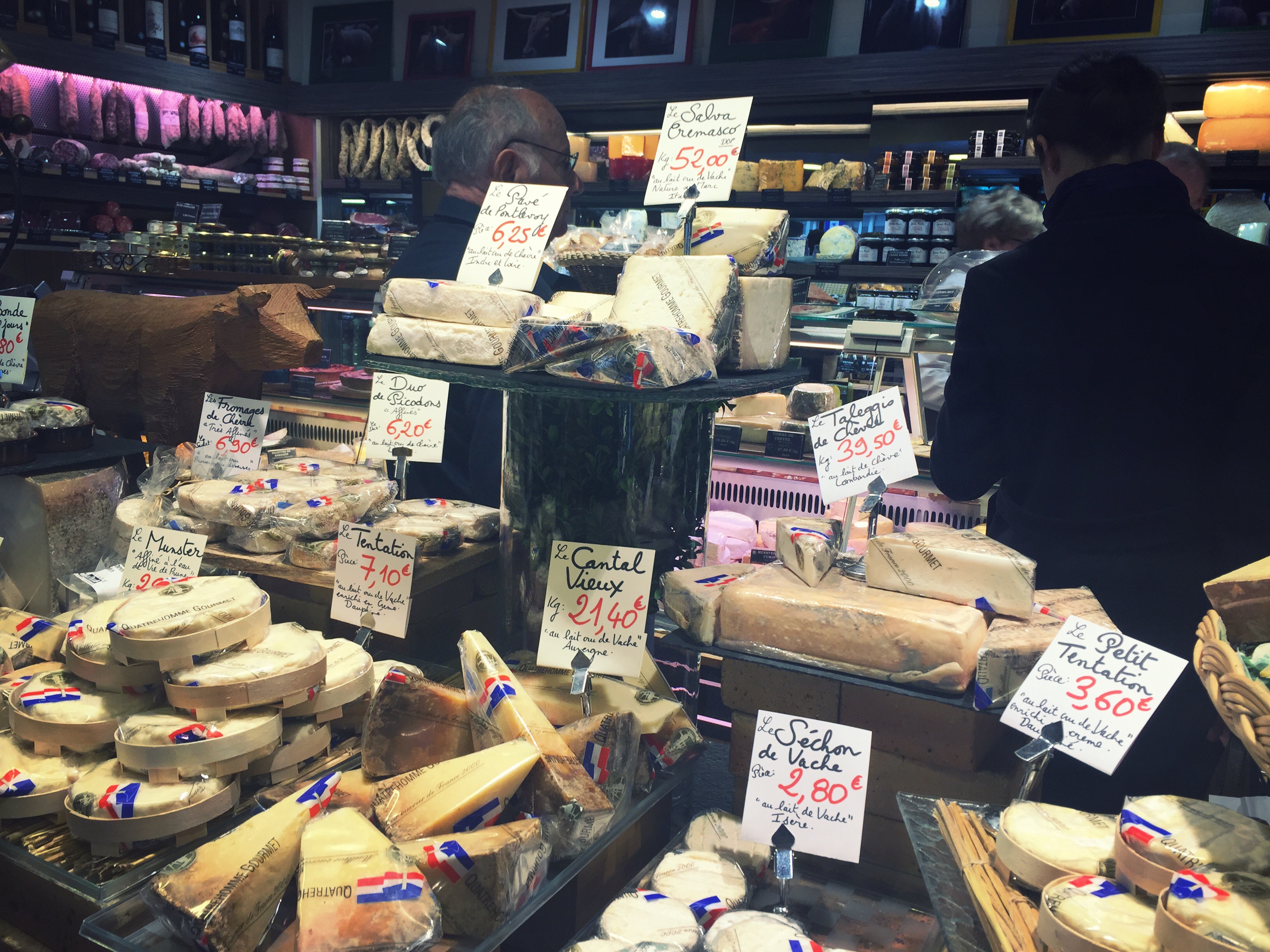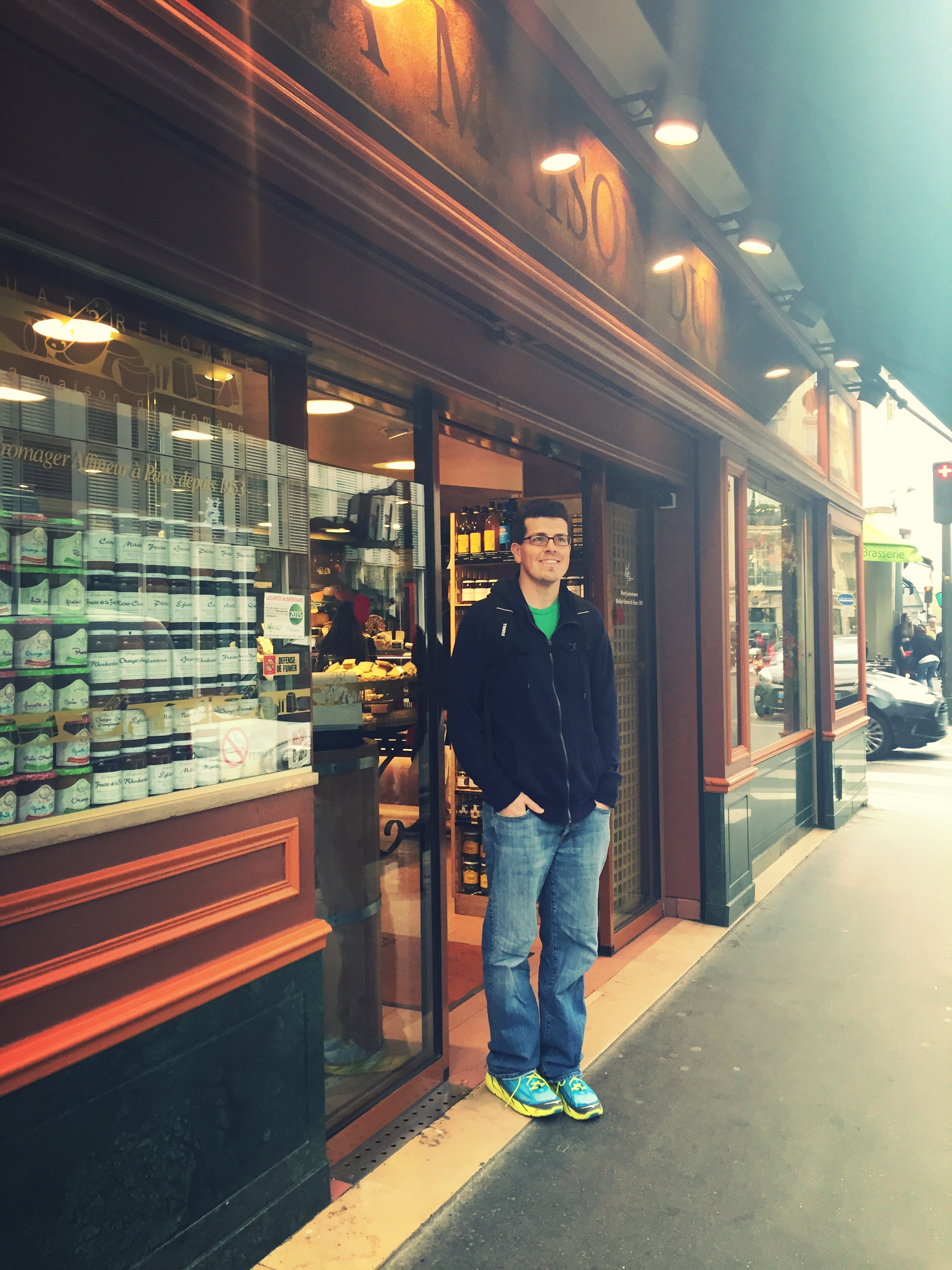 The next morning was a lazy morning as we were all trying to get our sleep scheduled adjusted. The night prior we had noticed a trendy restaurant a few blocks away that was packed with a long wait. We decided to check it out for lunch, and the entire group was so happy that we did. ANoste did not disappoint. It was incredible. They served us tapas style: duck spring rolls, calamari in a large boot, charcuterie, giant prawns with apple, duck on coals, and some french fries. We walked around the opera district for awhile, window shopping. Michael bought some new shoes, and I tried on Apple watches. The group decided to search out the top cheese shops and meat shops, so we ask around for the local’s favorite fromagerie and charcuterie. We headed towards Fromagerie Quatrehomme, La Masion du Fromage and Vérot Charcutier. Michael was in heaven at the cheese shop, and he picked out medley of cheese for our apartment. We were in the Montparnasse area, so we checked out Le Bon Marché, an incredible supermarket. We got some pate and other goodies at Vérot and then sat down to enjoy some tea and cafe au last to allow the runners to get off their feet. On the way back, Michael and Allison decided to take the train route to their race, so they’d be prepared bright and early the next morning.