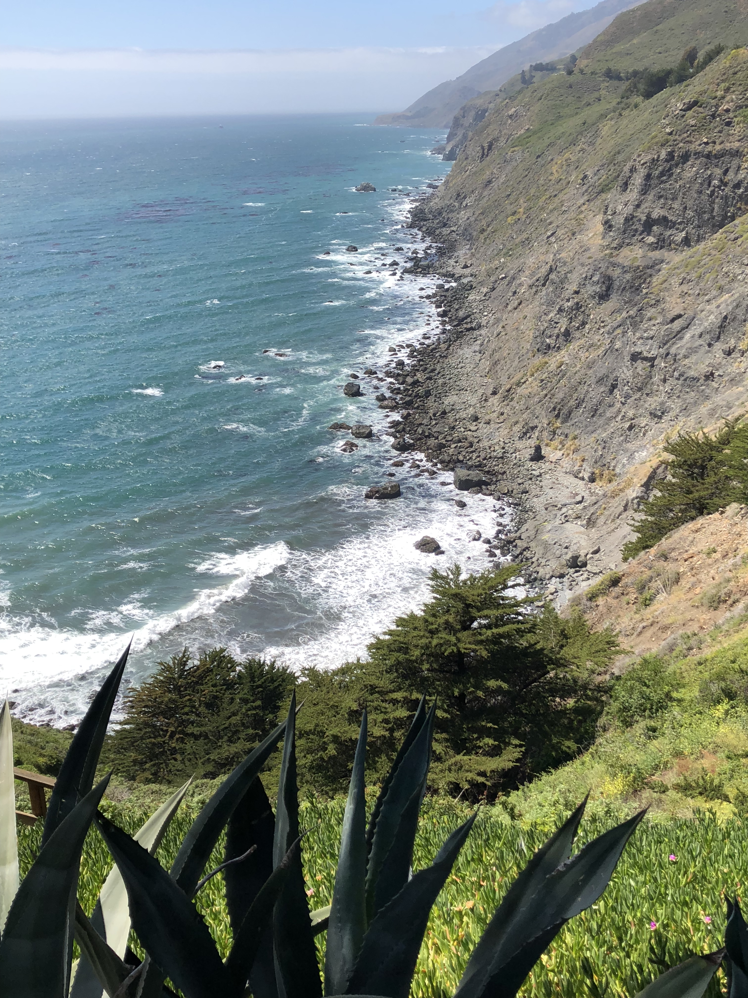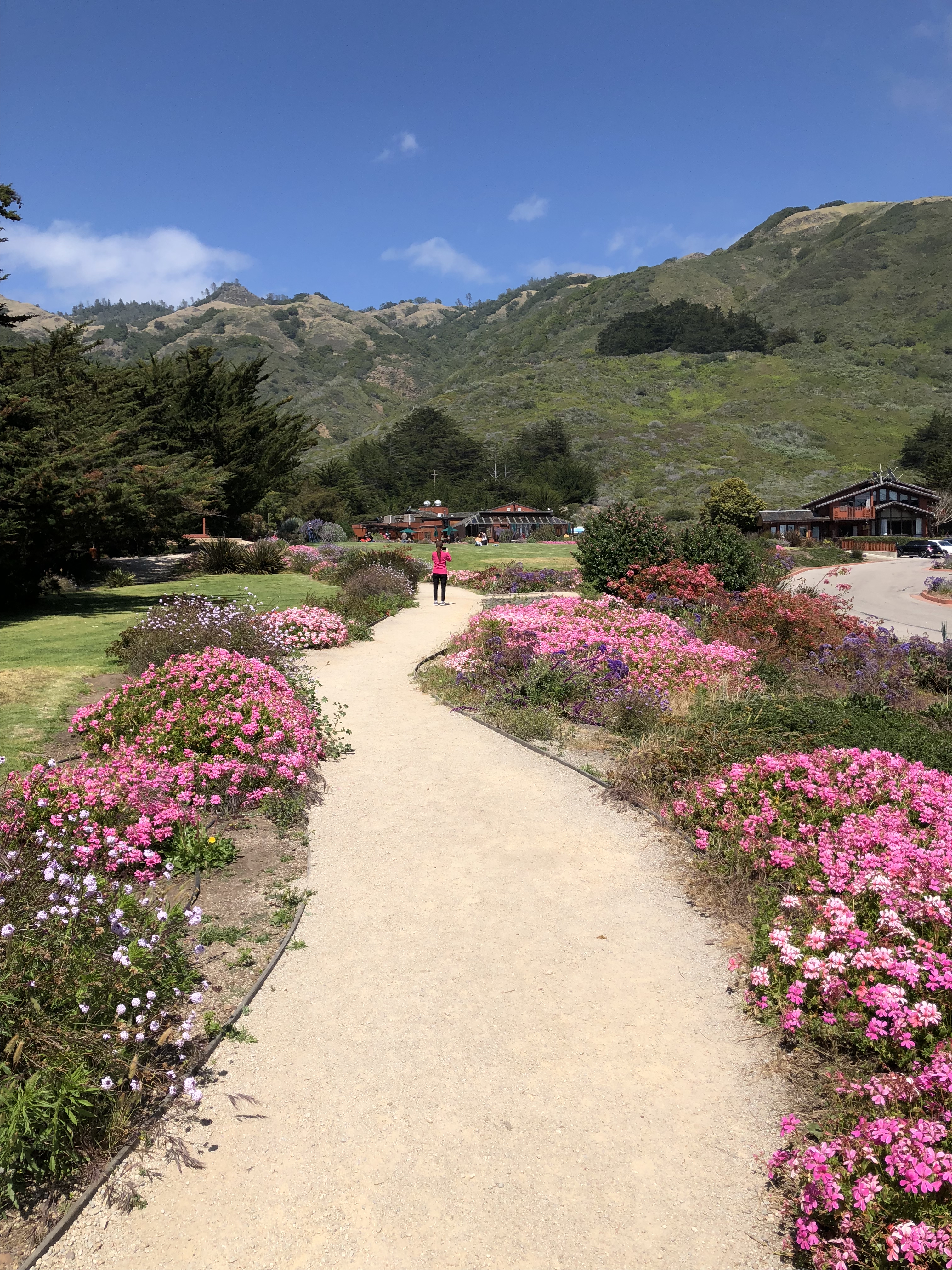 From here, we started to enter Big Sur, and this is when the cliffs became steep and the road winding. The road was so close to the ocean, it provided beautiful views. We were all really hungry, so we pulled into a place called Ragged Point Inn and Resort. It was a first real chance to walk along the steep coastline to get some good pictures and views. The place had really nice green space and flowers, and we all had sandwiches on their picnic tables outside.