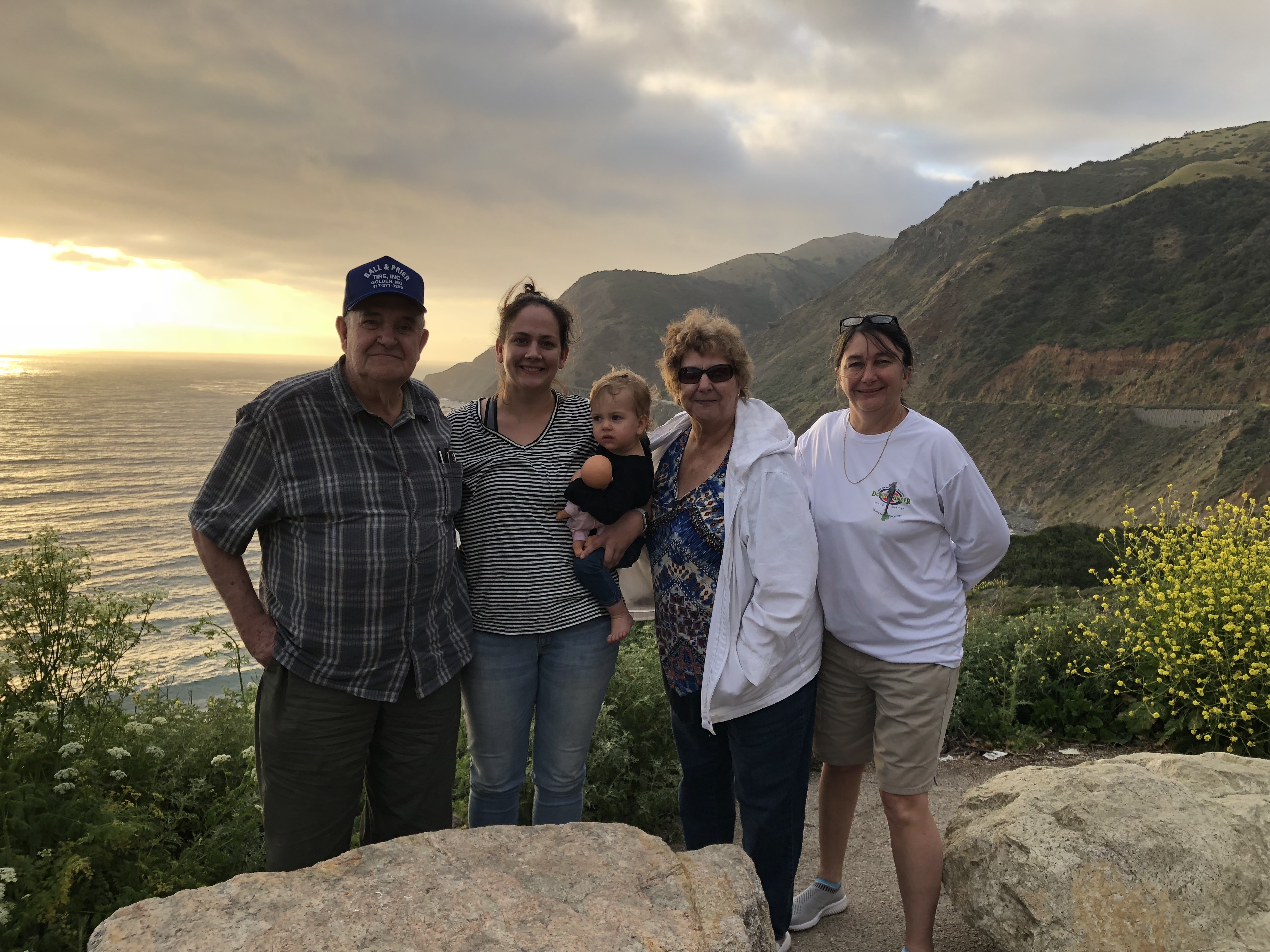 We drove on farther and came to a road closure at Salmon Creek Falls. We talked to some local hikers (they were so nice), and they suggested a backroad route that was the only option, but a HUGE detour to be able to get back on the road. [Side note: the road didn’t open back up until July 18th, after a 14 month closure due to a massive landslide followed by an emergency repair project. As of July 18th, you can now drive the whole 90 miles of coastline between Carmel and San Simeon.] So we backtracked to what probably ended up adding three hours to our trip. But it was surprisingly beautiful, and I’m so glad we did. We went back south passed Hearst Castle, passed San Simeon and Sambria, and took Highway 46 east. It was across the top of a mountain through vineyards and other ranches. We then hoped on Highway 101 for a short time north, and then we took G18 through Fort Hunter Liggett, an army fort. After exiting the fort, the roads went up through Los Padres National Forest (mountains) again (to cut back to the coast). It was extremely steep, and a bit scary to drive a times, but it was a neat drive. Coming out of the mountains, we were treated to a spectacular sunset. We got back to the coastline around Lucia, and headed north towards Monterey to try to find a place to sleep. We got to enjoy light and cool sunsets along the coastline for about 45 minutes more before it got dark. I was a bit bummed because it was supposed to be some of the most beautiful part of the coastline. I thought maybe I’d wake up early and try to drive it again the next day. We started feeling desperate for gasoline, and we finally came to one on the outskirts of Monterey to save us. It was expensive, but we didn’t care. It’s better than getting stranded. We started to get desperate for a place to sleep in Monterey. We arrived much later than originally planned, and due to the holiday weekend, everything was booked. One of the hotels finally referred us to a friend’s hotel called Fireside Lodge, so we tried it. It was ridiculously expensive for what it was, but grandpa said he was sick of the car and wanted to stay. I was trying to negotiate the lady down to a lower rate, and mom starts hollering from the car for me. Rosalie is vomiting everywhere because of the curves. She’d gotten fussy, so I gave her the kindle to play on and apparently it made her carsick. Nevertheless, this sealed the deal for us to stay. Because the rooms were so limited, we got a suite with two rooms which was nice for our group size. Mom and I ran out to get dinner for the group, and we tried to get a little dessert to sing grandma happy birthday. It was a lame attempt, but the thought was there.