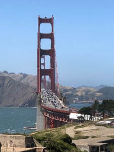 Today was our day to explore Yosemite National Park. I’d been once before in 2007, and I remembered it being beautiful. Memory served me well as the view points and vistas were outstanding. The park was busy, as expected, but the park ranger said it was not nearly as busy that day (Tuesday) as it had been the previous three days on the holiday weekend. We first made out way up Wawona Road and took at right on Glacier Point Rd. We had to wait in a well-organized line of cars to take our turn going out to Glacier Point (which provides the best views of Half Dome) because they limit the number of cars. After about half an hour, we made it to Glacier Point, stopping at the scenic overlooks along the way. Half Dome with the other mountains, and surrounding waterfalls, really is breathtaking. After we had looked our fill at Half Dome and saw the overlook of Yosemite Valley and El Capitan, we headed down to explore the visitor’s center. We got a picnic lunch at the park’s grocery store, and we had a nice lunch next to a bunch of rock climbers on one side and a meadow on the other. The mosquitoes were bad, so it was a bit rushed, but it was still a nice break. From Yosemite Valley, we explored the option of driving along Tioga Road to the Tuolumne Meadows Visitor Center (grandpa really wanted to), and then rounding the top of the park on the north side to get back to San Francisco, but it was going to add about six hours to the trip, and we didn’t have it in us. As it started to get dark, we headed back across the state towards San Francisco. We had one day left on our trip, and we wanted to explore a bit more of the coastline as well as San Francisco. We made it to Oakland, CA and stayed in Best Western Plus Bayside Hotel, a new clean version of the hotel on the water of Brooklyn Basin. We walked a small trail along the water and ordered Mountain Mike’s Pizza for delivery. It was delicious.